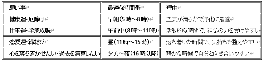 自分の願いごとに合った時間帯を選ぶことで、より良いご利益を受けることができます。ぜひ、最適なタイミングでお参りをしてみてください!